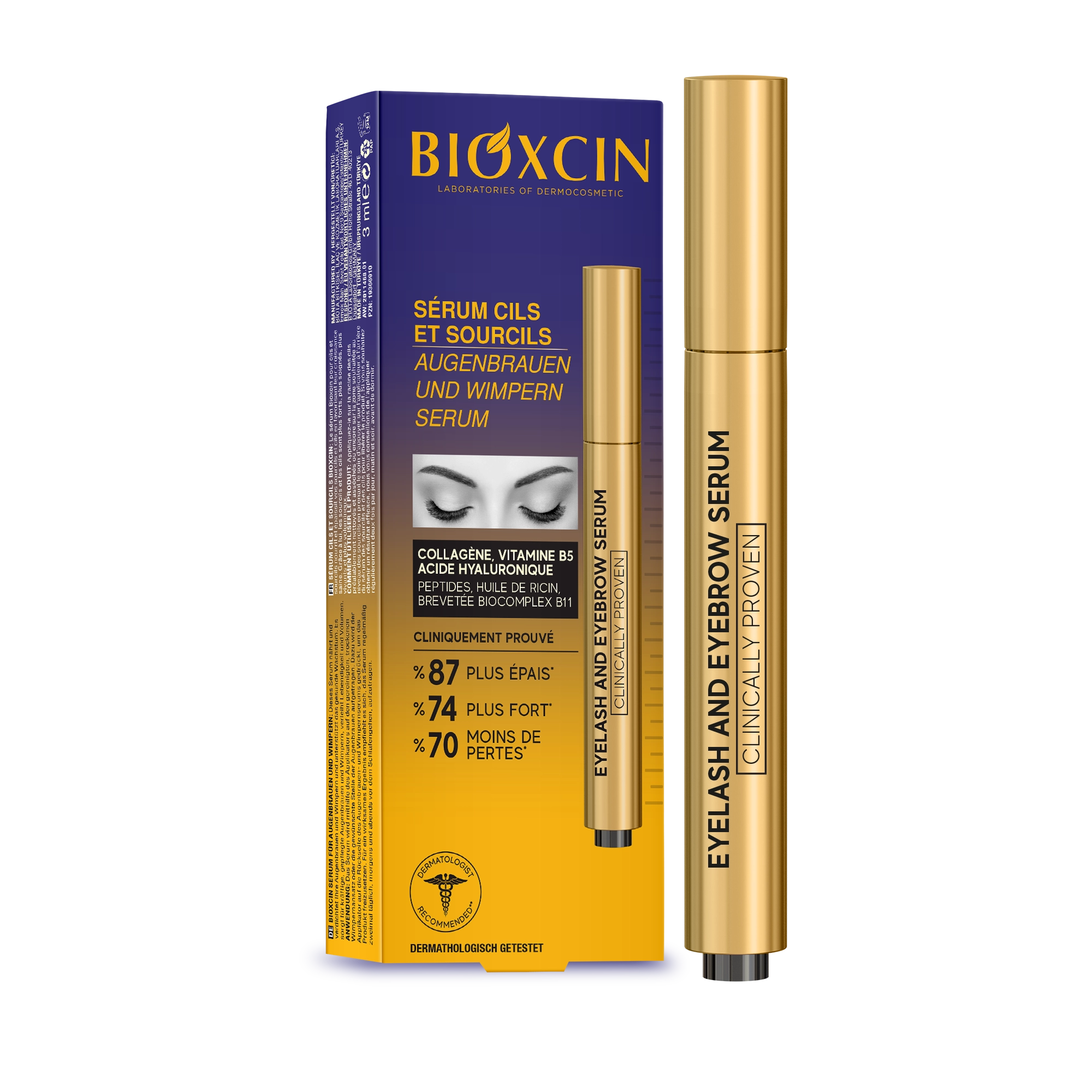 Bioxcin Augenbrauen- und Wimpernserum; Ausgedünnte, dünne Augenbrauen und Wimpern werden durch den Extrakt aus Efeublättern (Hedera Helix), BioComplex B11, Hyaluronsäure, Biotinoil Tripeptid-1, hydrolysiertes Kollagen, Rizinusöl, Glycerin, Vitamin B5 und PRODEW® 500 (Aminosäuren-Komplex) genährt, gestärkt und fördert gesundes Wachstum.