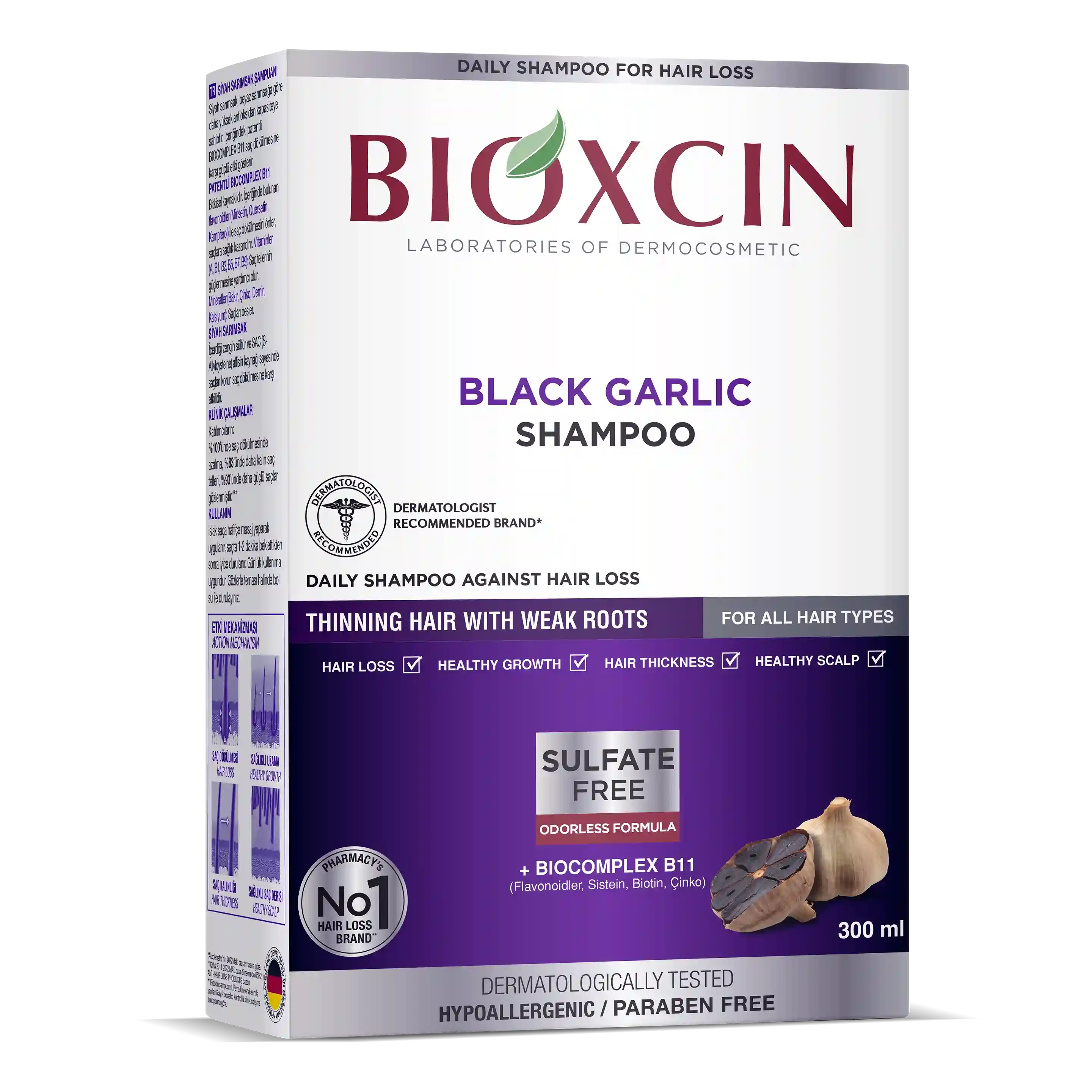Bioxcin Schwarzer Knoblauch Shampoo enthält 100% schwarzen Knoblauchextrakt und bietet umfassende Haarpflege. Schwarzer Knoblauch stärkt die Haarwurzel, nährt die Kopfhaut und unterstützt ein gesünderes und kräftigeres Haarwachstum. Außerdem verleiht schwarzer Knoblauch dem Haar Volumen, Glanz und Geschmeidigkeit. Das Bioxcin Black Garlic Shampoo enthält auch andere natürliche Bestandteile wie den Kräuterextrakt BioComplex B11, bioaktive Peptide und Efeuextrakt. Diese Komponenten helfen, Haarausfall vorzubeugen, tragen zu dickerem und fülligerem Haar bei und fördern ein gesundes Haarwachstum.
